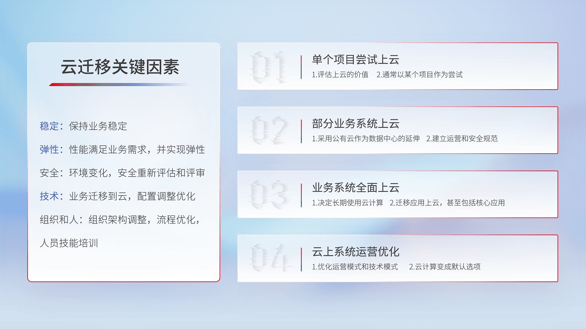 结合实际业务,,,从规划设计、、、、云平台选型、、云原生改造、、数据迁移、、、、集成交付,,,,迁移全过程为客户识别最佳上云路径,,做好风险识别管理,,设计网络架构、、身份权限、、安全审计合规、、、操作审计、、、日志审计、、监控告警策略、、、、多站点容灾设计等,,,对云上基础设施进行整体规划,,提升IT治理水平,,以满足弹性、、、、高可用、、、高性能的需求。。。