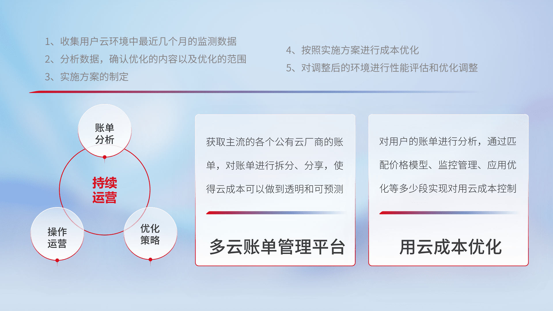 通过多云纳管,,以统一的资源数据模型把客户的云资源进行抽象和封装,,,进而实现对多云资源的统一操作,,,,保障云资源管理的可靠性、、、稳定性与可用性。。。。量身定制化运维内容,,,,配置、、、开发运维、、补丁管理、、、、备份、、监控、、、认证和访问管理、、、、审计和日常巡检等,,,,保障在用云过程中的可靠度,,稳定度以及高可用率。。